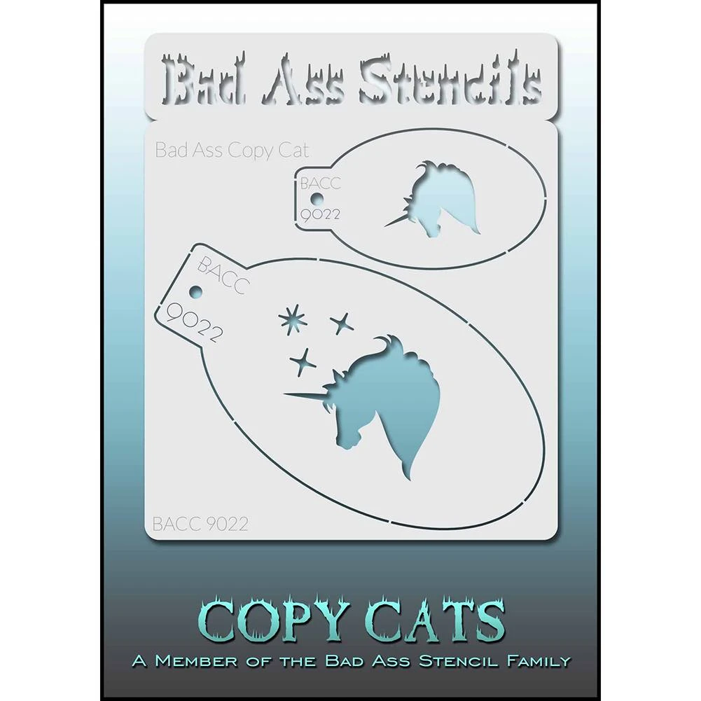 Bad Ass Copy Cat Stencils – Unicorn (9022) work great for adding design details over face and body. Each sheet is 5.5″ x 3″ with two stencils that can be separated and used to create multiple designs based on same pattern. Each Copy Cat Stencil has one mini stencil (3.5″ x 5″) and one half ass stencil (3.3″ x 2″), both based on a common design pattern. Each stencil piece can be taken apart and used individually to create designs of different sizes on different parts of the body.